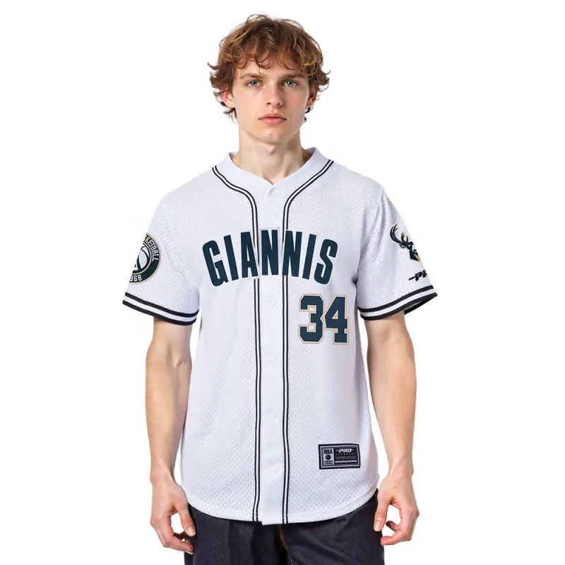 NBA MILWAUKEE BUCKS GIANNIS ANTETOKOUNMPO #34 CLASSIC MESH PNN MEN’S MESH BUTTON DOWN SHIRT (WHITE\/BLACK\/WHITE)