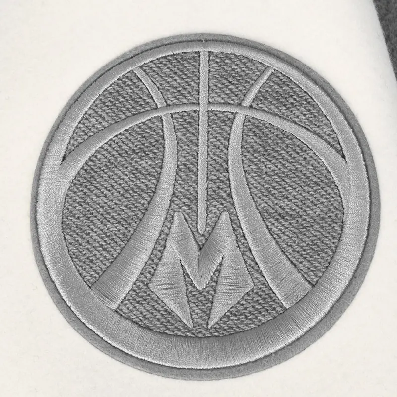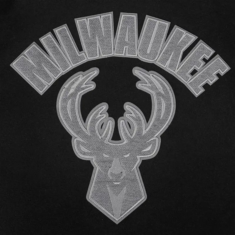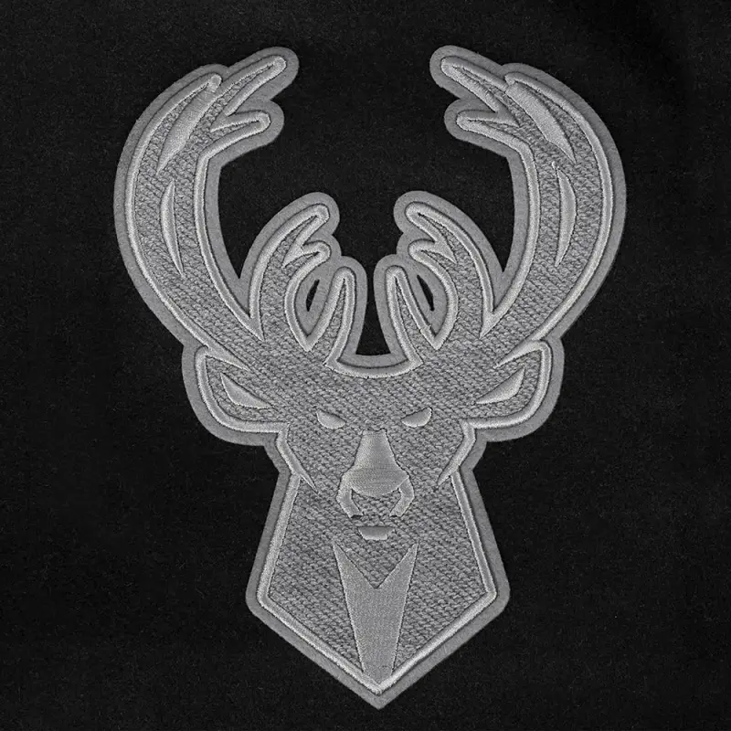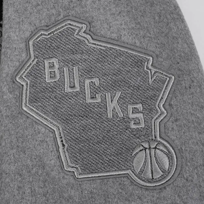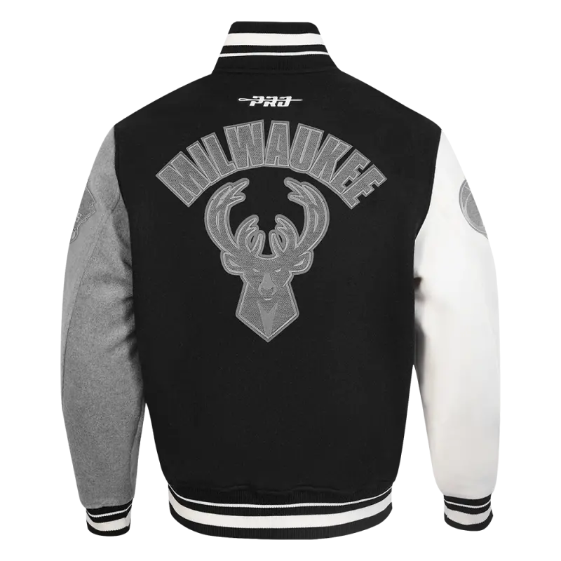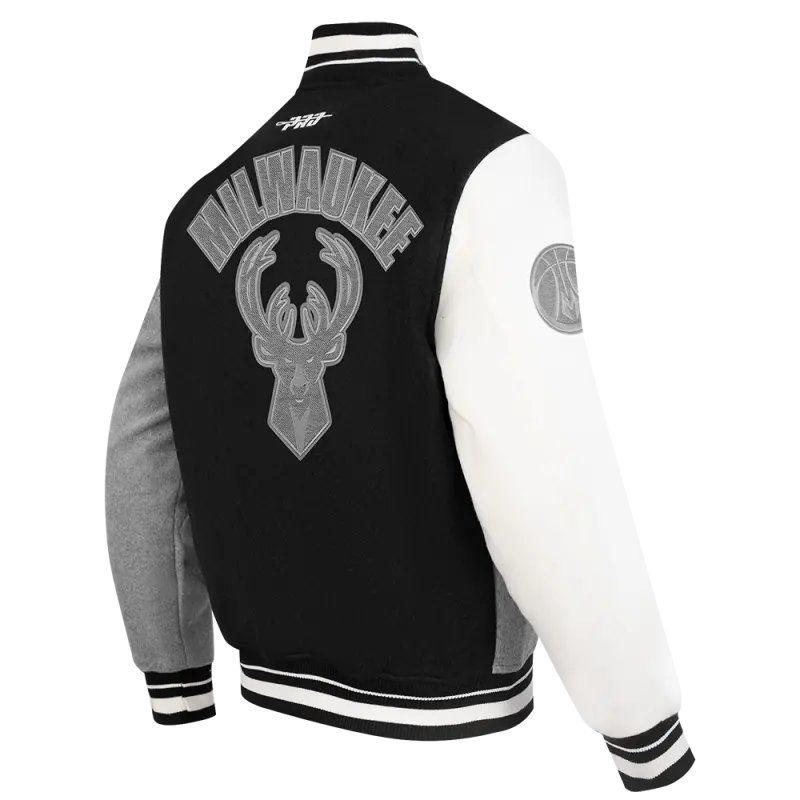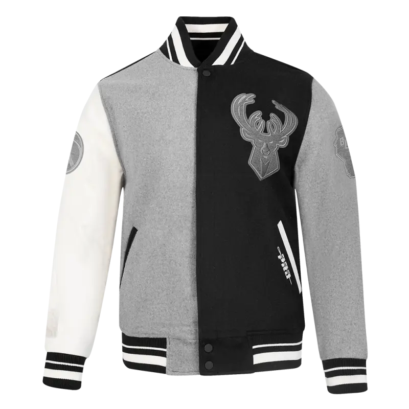 NBA MILWAUKEE BUCKS REVERSE FRENCH TERRY MEN’S COLOR BLOCK WOOL VARSITY JACKET (BLACK\/GRAY\/EGGSHELL)