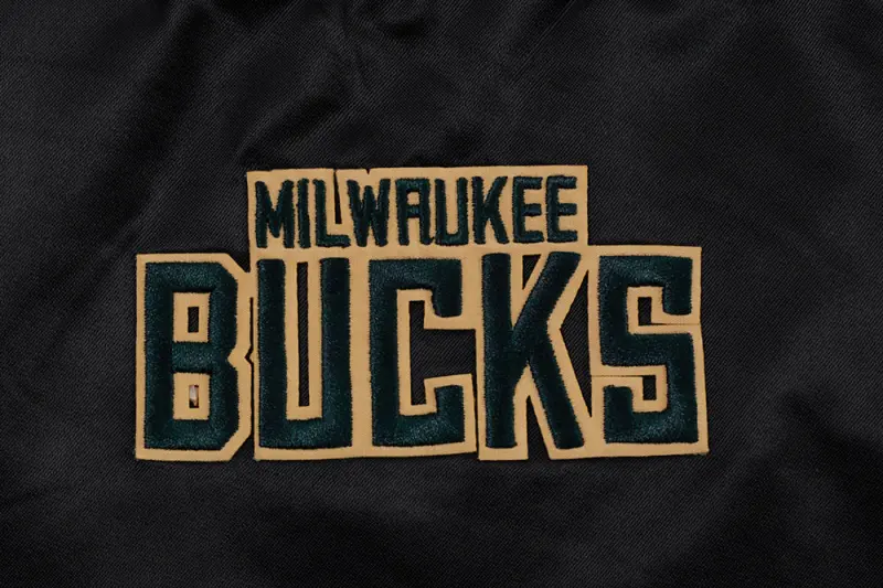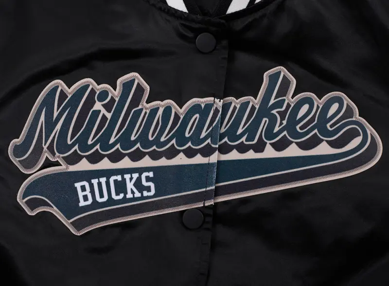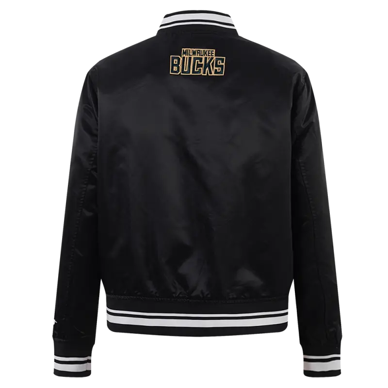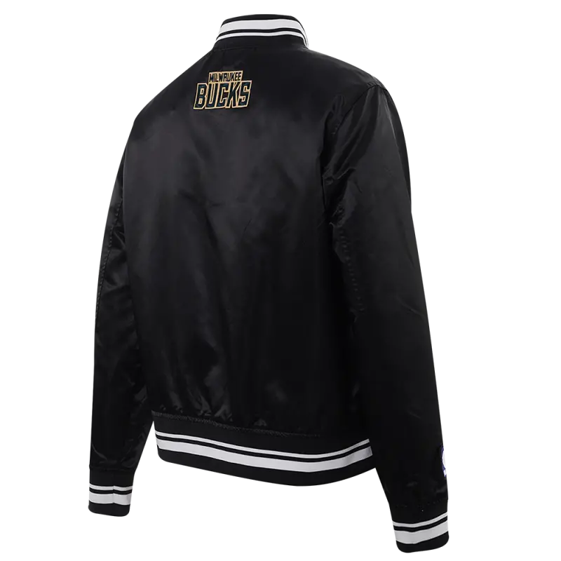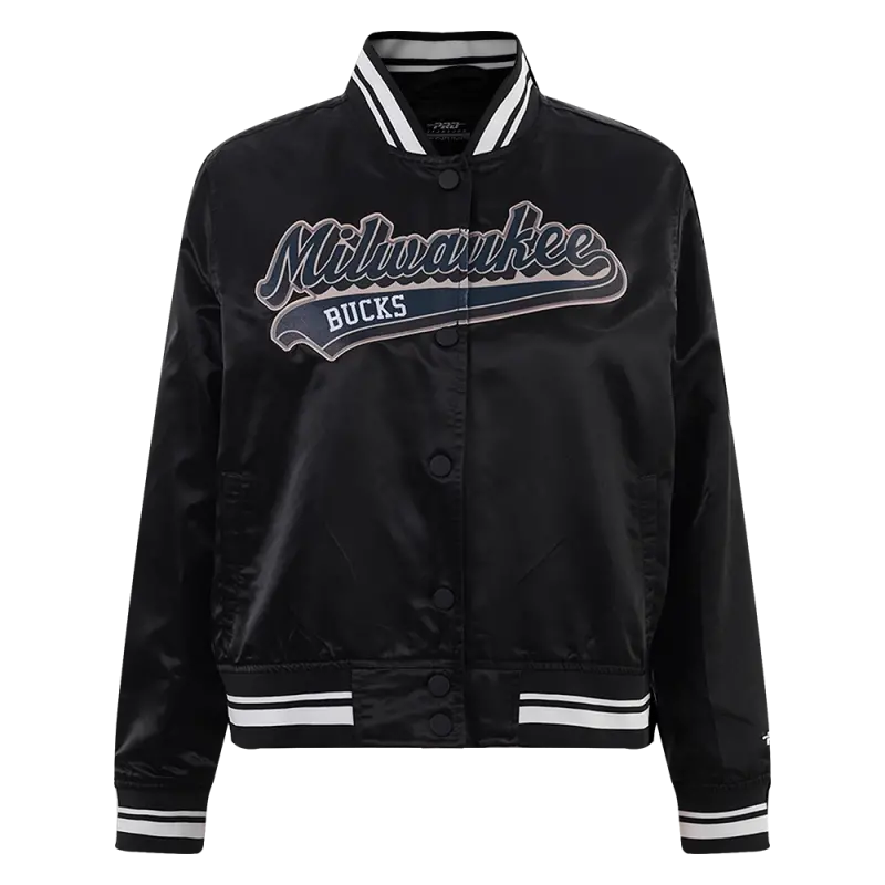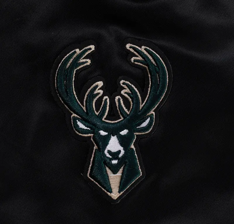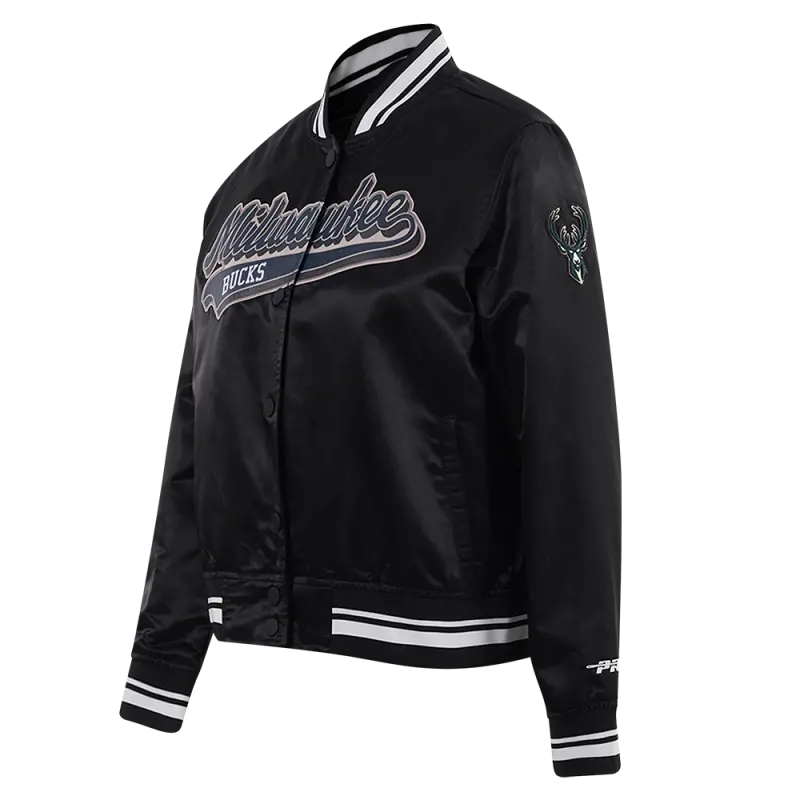 NBA MILWAUKEE BUCKS SCRIPT TAIL WOMEN’S SATIN JACKET (BLACK)