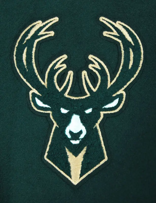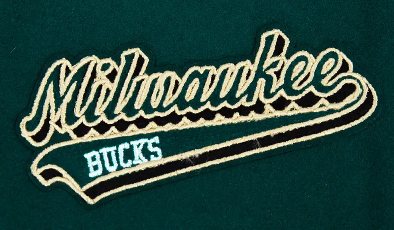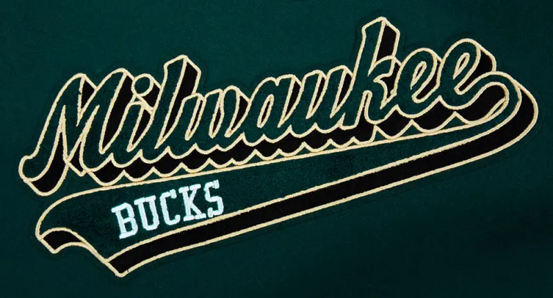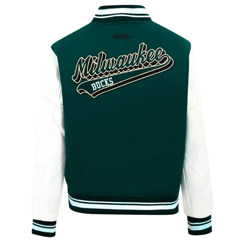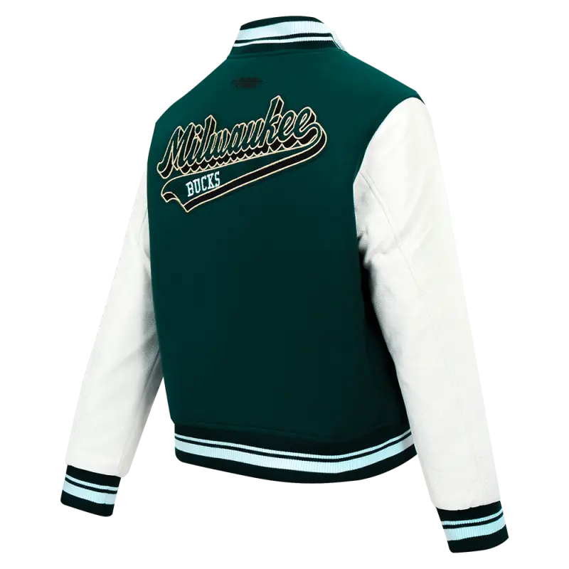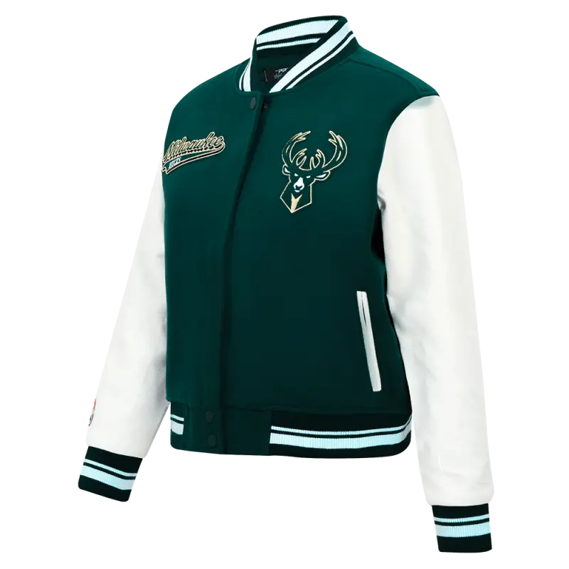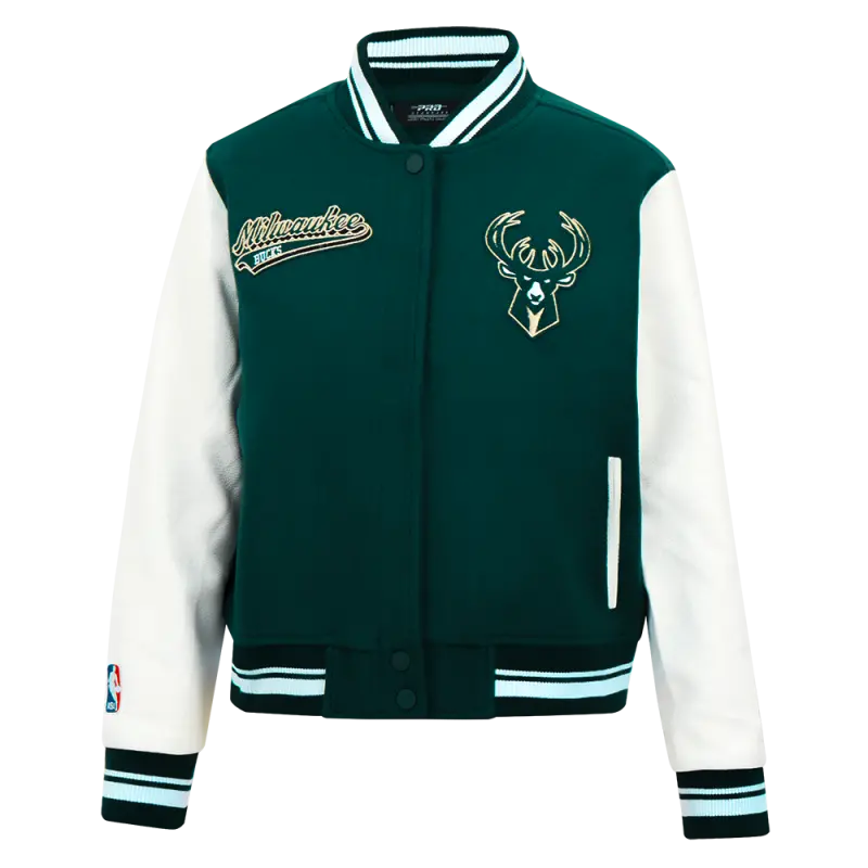 NBA MILWAUKEE BUCKS SCRIPT TAIL WOMEN’S WOOL VARSITY JACKET (FOREST GREEN\/WHITE)
